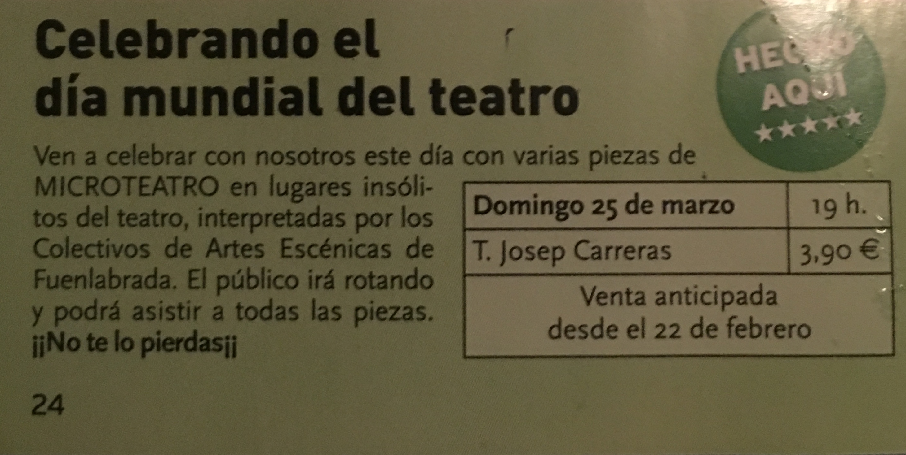 Ven a celebrar con nosotros este día con varias piezas de MICROTEATRO en lugares insólitos del teatro, interpretadas por los Colectivos de Artes Escénicas de Fuenlabrada. El público irá rotando y podrá asistir a todas las piezas. ¡¡¡No te lo pierdas!!!